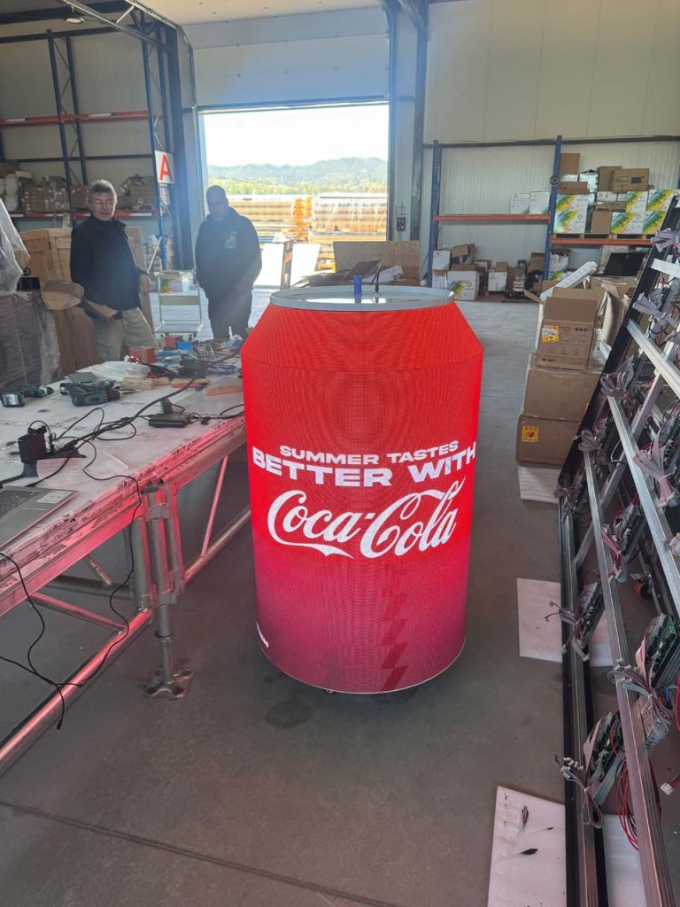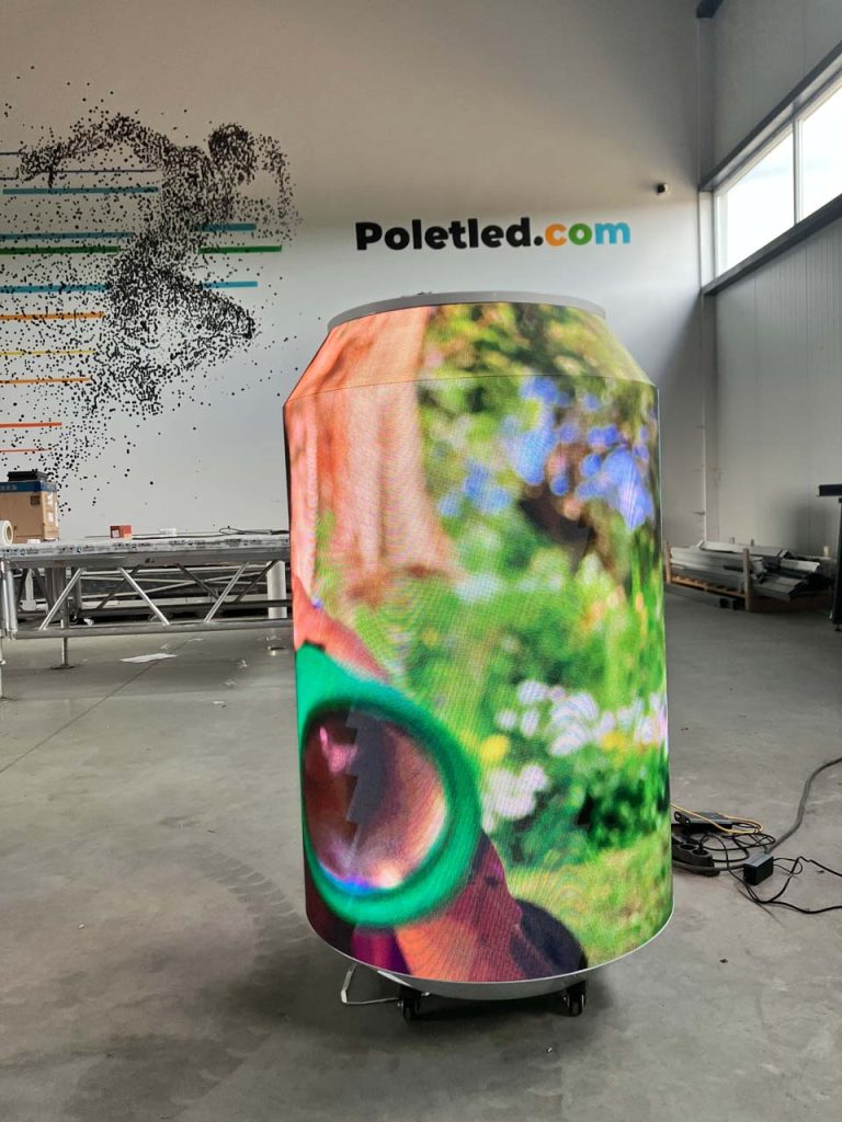 The structure is built using customized POLET Ph2.5 flexible LED displays, known for their exceptionally sharp image quality and impressive performance. The display design precisely follows the shape of the can, standing 1300 mm high and diameter of 800mm, mounted on a mobile wheeled housing for easy movement and setup in various promotional environments.