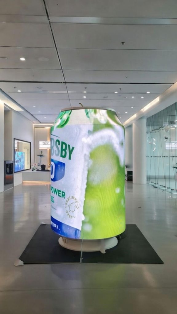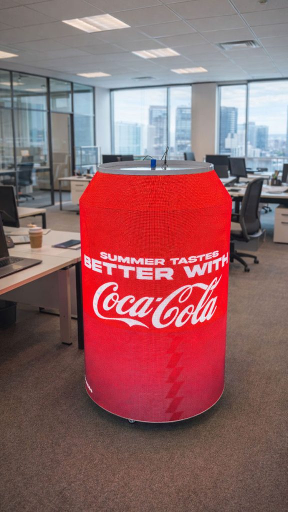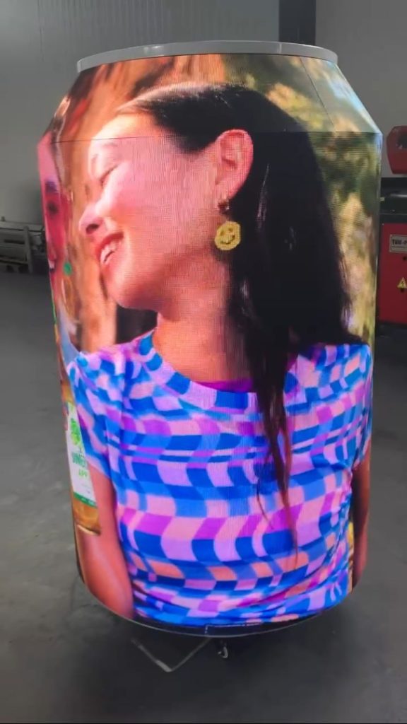 The structure is built using customized POLET Ph2.5 flexible LED displays, known for their exceptionally sharp image quality and impressive performance. The display design precisely follows the shape of the can, standing 1300 mm high and diameter of 800mm, mounted on a mobile wheeled housing for easy movement and setup in various promotional environments.